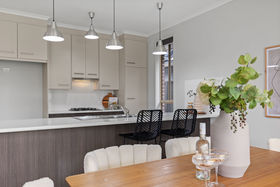 At the heart of the home, the open-plan family and dining area is filled with natural light thanks to expansive south-facing windows. The modern kitchen impresses with feature pendant lighting, gas cooktop, electric oven, dishwasher, and ample bench and cupboard space " ideal for both family living and entertaining.